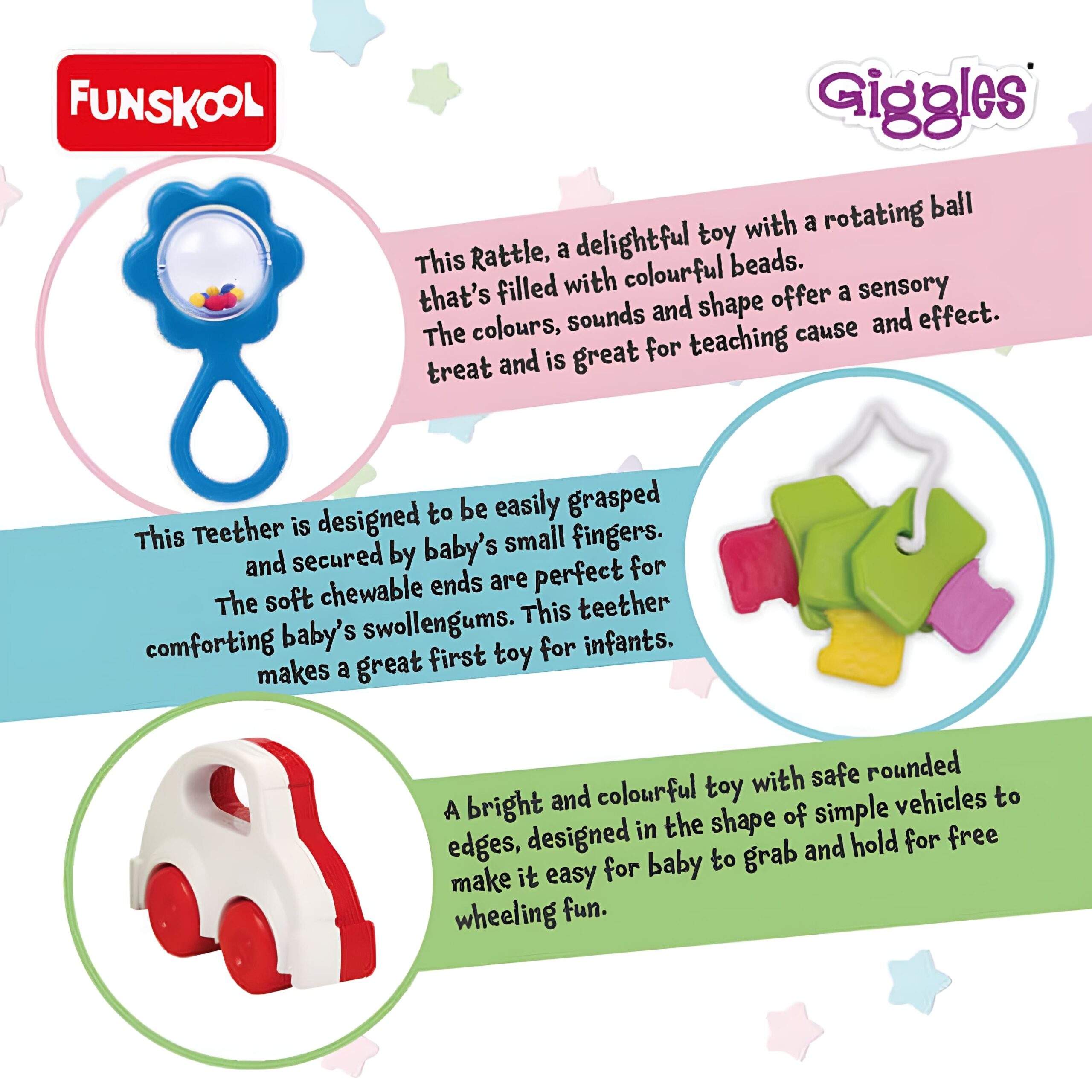 Your baby will love shaking, chewing, and rolling their way to discovery with the Giggles Funskool Gift Set Mini!